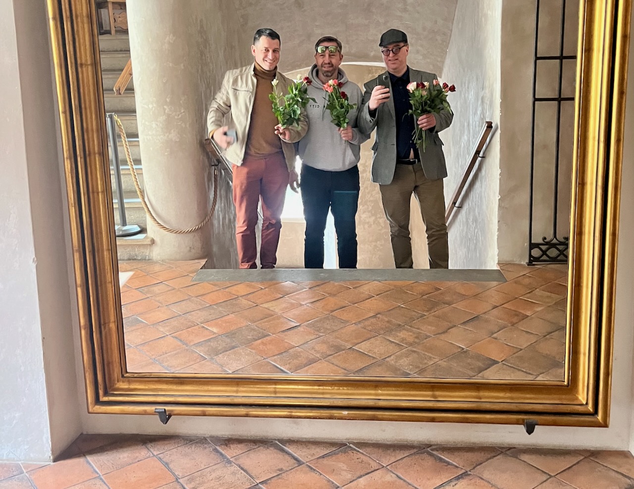 V pátek bylo MDŽ, takže jsme nakoupili růže a zopakovali loňskou akci, kdy jsme obešli zaměstnankyně úřadu a popřáli jim k jejich svátku. Na snímku jsme zachyceni v zámeckém časoprostorovém portálu… :)