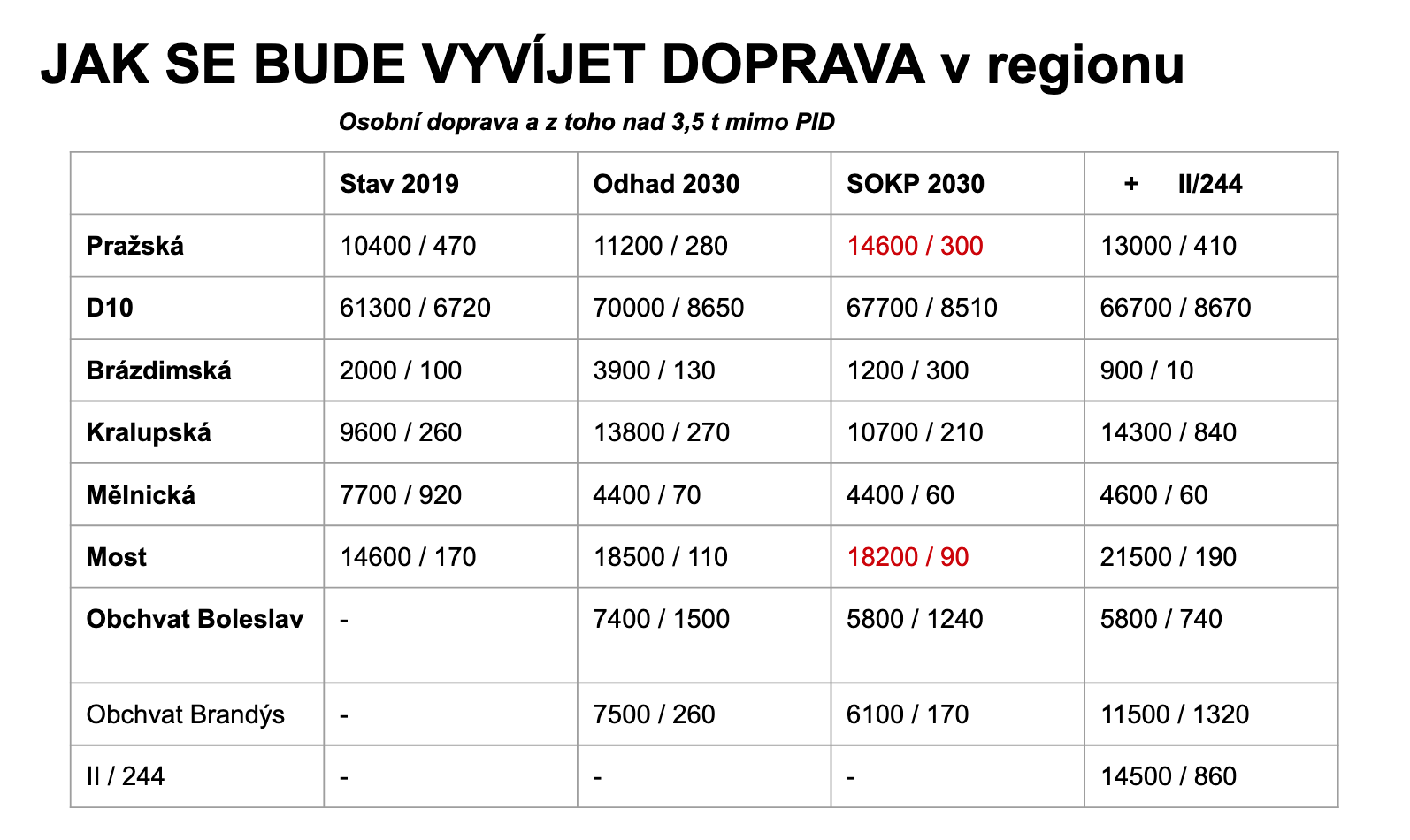 Z prezentace dopravních výhledů města podle dat TSK. Pokud se postaví Severní okruh kolem Prahy (SOKP/D0), tak nám doprava na klíčových uzlech vzruste o polovinu. Pokud ne, tak jak kde, ale taky. Jak si asi tak myslíte, že se to projeví na její plynulosti…?