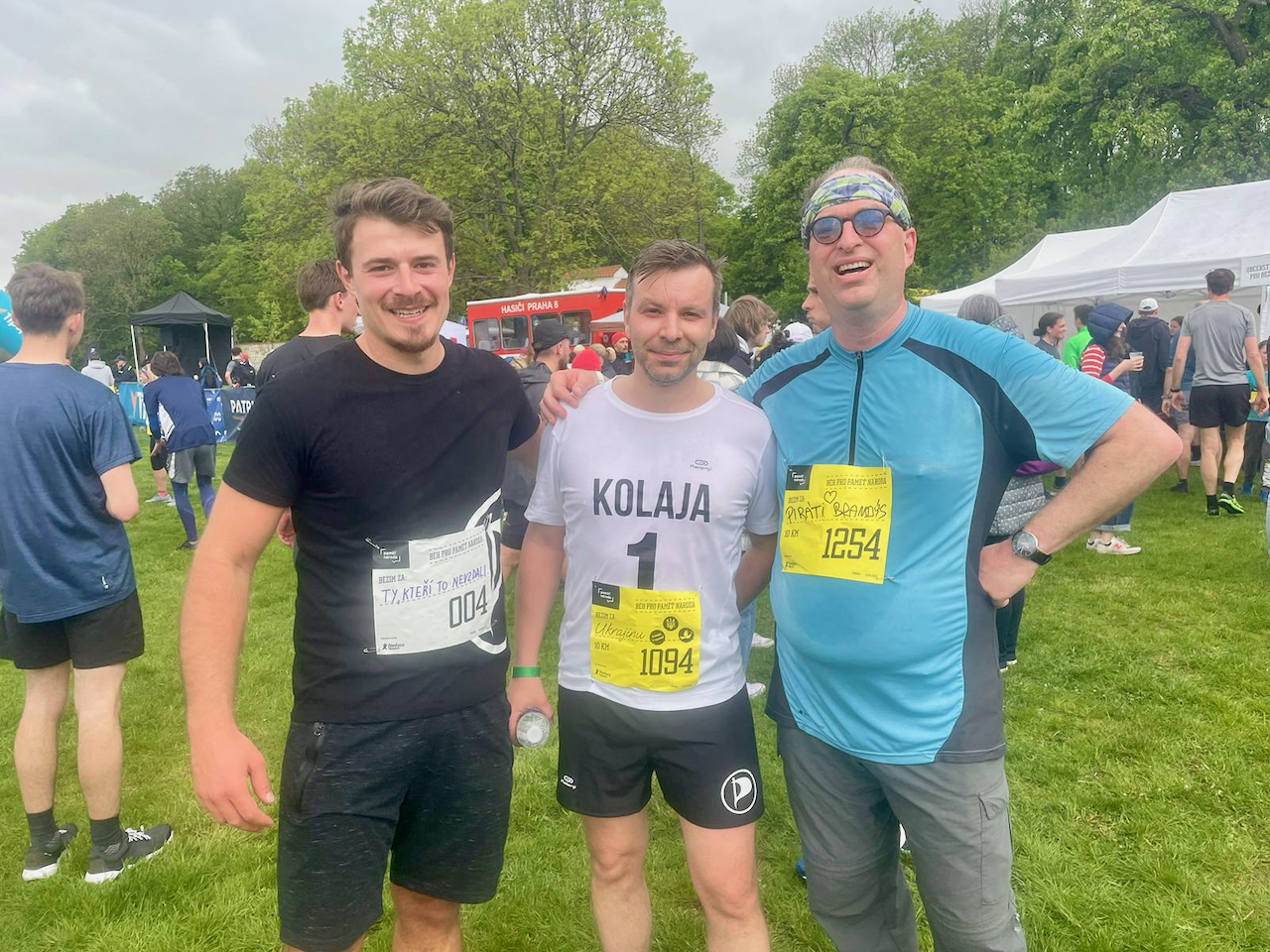Zastupitel Líbeznic Sam Volpe, europoslanec Marcel Kolaja a vpravo já po doběhu. Samozřejmě jsem si pozdě přečetl, že si na to číslo píšeme, za jakou oběť běžíme, ne jméno týmu - ale pořád jsem na tom lépe, než poslanec za ANO Ondřej Prokop, který si tam napsal, že běží za Andreje Babiše. No, doběhl deset minut za mnou 😇