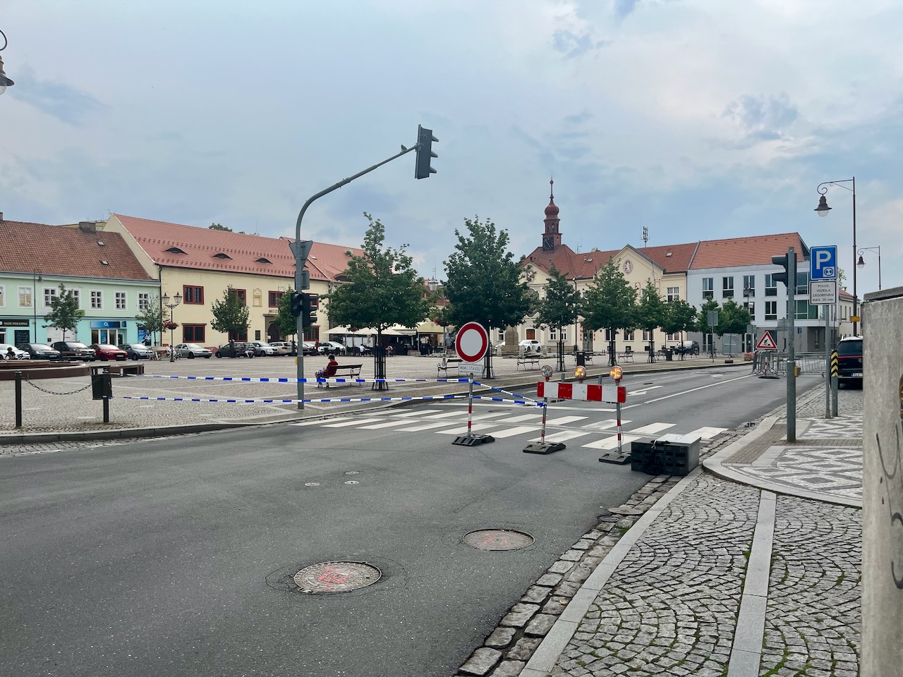 Neprůjezdná je i část Masarykova náměstí kvůli opravě kanálů. Dokud jsme nepřidali tu hnusnou pásku, řada řidičů do uzávěry vjízděla a motala se mezi výkopy.