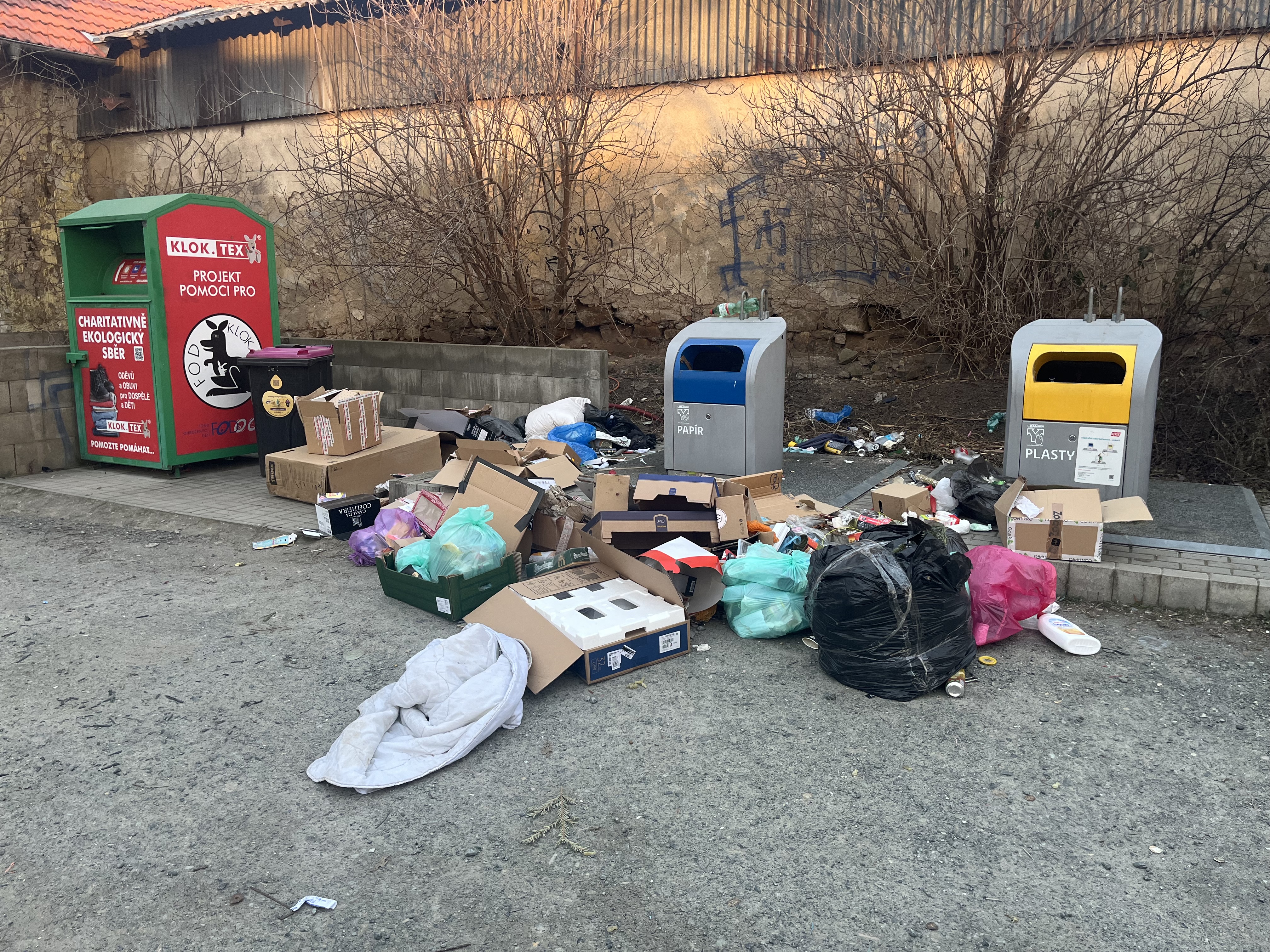 Fakt, nekecám, to není aranžovaná fotka. Seifertova ulice, reálný snímek. Ty pytle jsou se směsným odpadem, krabice se někomu nechtělo asi složit a nacpat do prázdného kontajneru nebo v nich rovnou přivezl jiný bordel. Několik původců jsme tu dohledali…