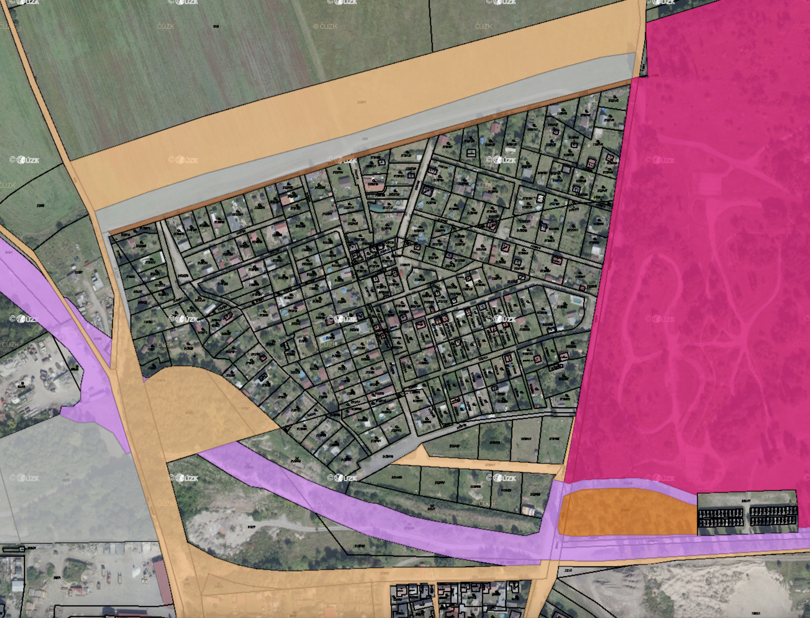 Oranžovou barvou jsou pozemky města, magenda jsou armádní, růžovou krajské (obchvat), hnědou je Státní pozemkový úřad. Zbytek jsou ostatní vlastníci.