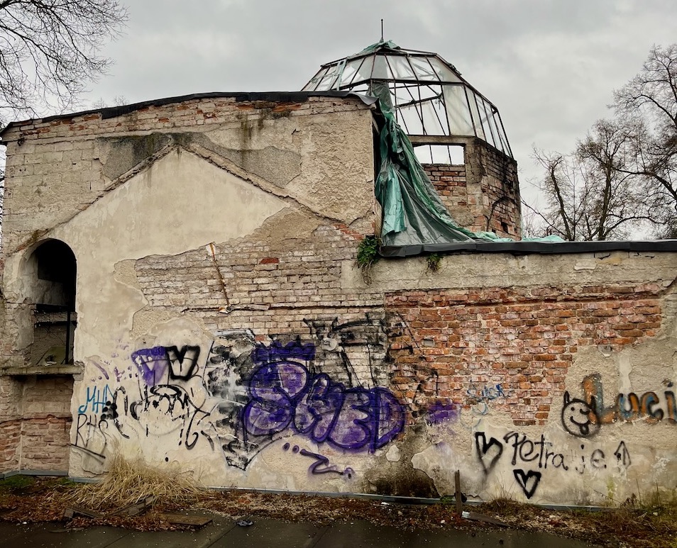 Stojíme na dnešní střeše, nad ní ještě měla být jedna střecha. Ta už dávno spadla. Tady je zdivo v nejlepším stavu, z Rucklových kopulí zbylo torzo.