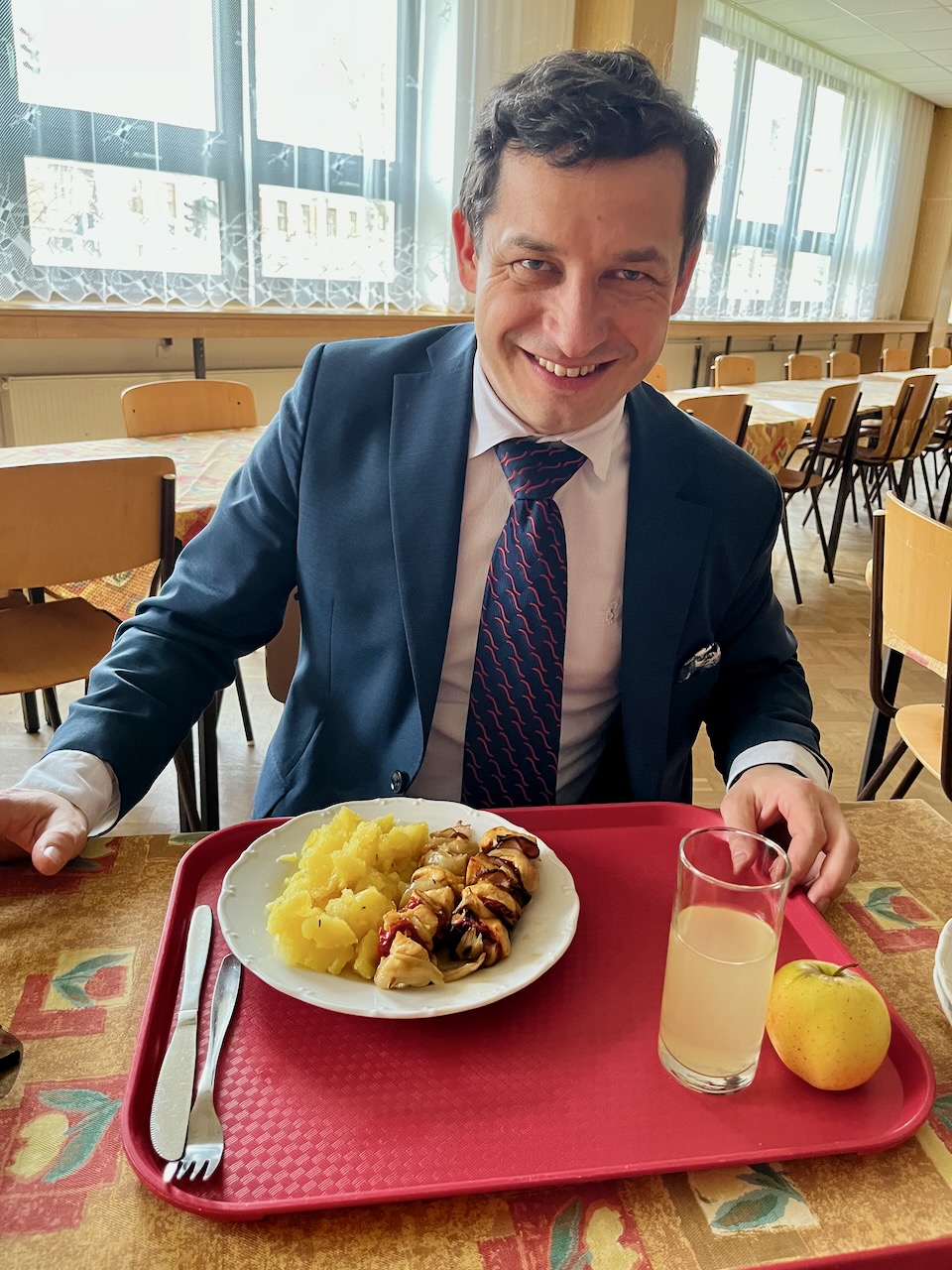 🍔 Se starostou jsme potom v rámci akce “vedení papinká to, co naše děti” zašli do školní jídelny. Servírovala se špenátová polévka a kuřecí špíz s bramborem. Naprostá spokojenost, polévka krémová se smaženým hráškem tří barev, brambory tak akorát a zejména špíz byl opravdu dobrý. Dobře si ty naše děti jedí!