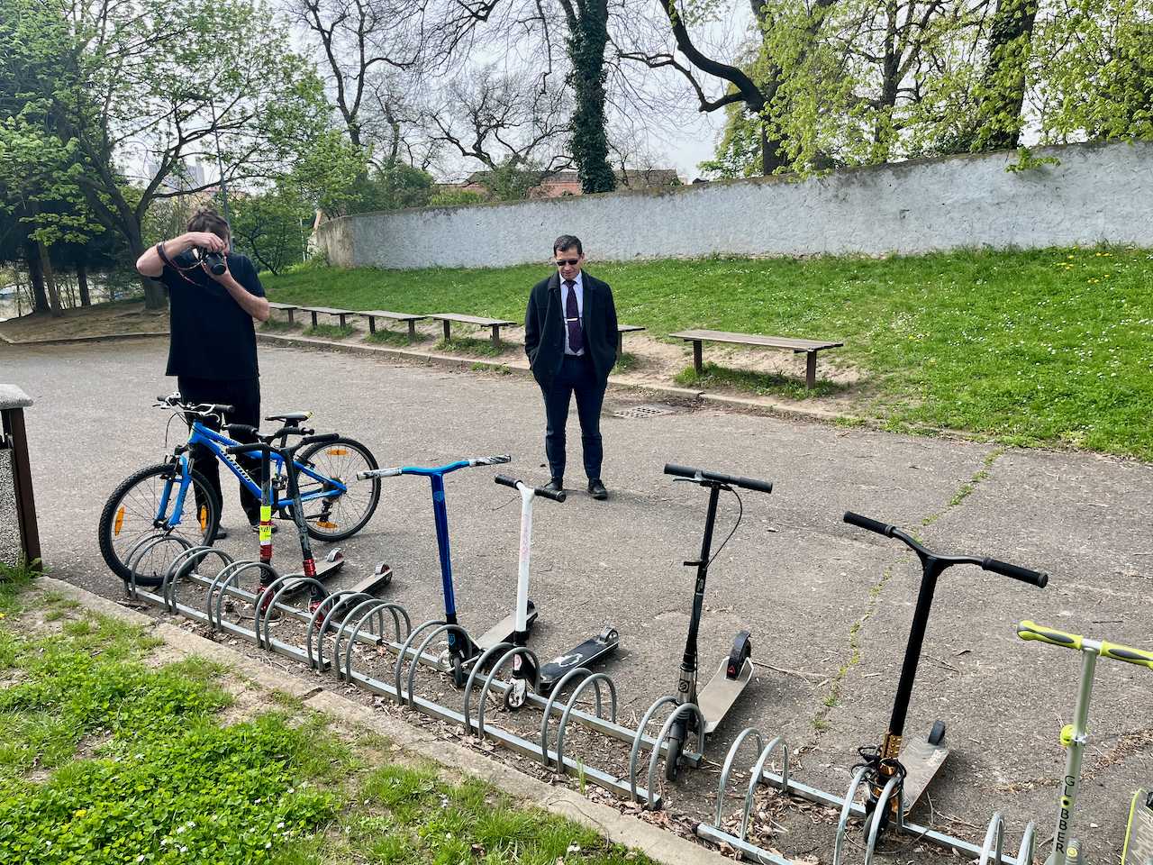 Tomáš Cach si fotografuje využití jinak nevyužitelných stojanů na kola, starosta Robert Pecha se zalíbením hledí na koloběžky.