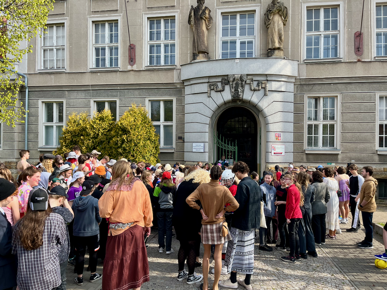 Když jsme dorazili na gymnázium, zrovna se studenti šikovali na majáles. Sluší jim to! Můj vzhled jeden z nich bodře ohodnotil “kámo, taky dobrý, kámo, jít za starýho!” …