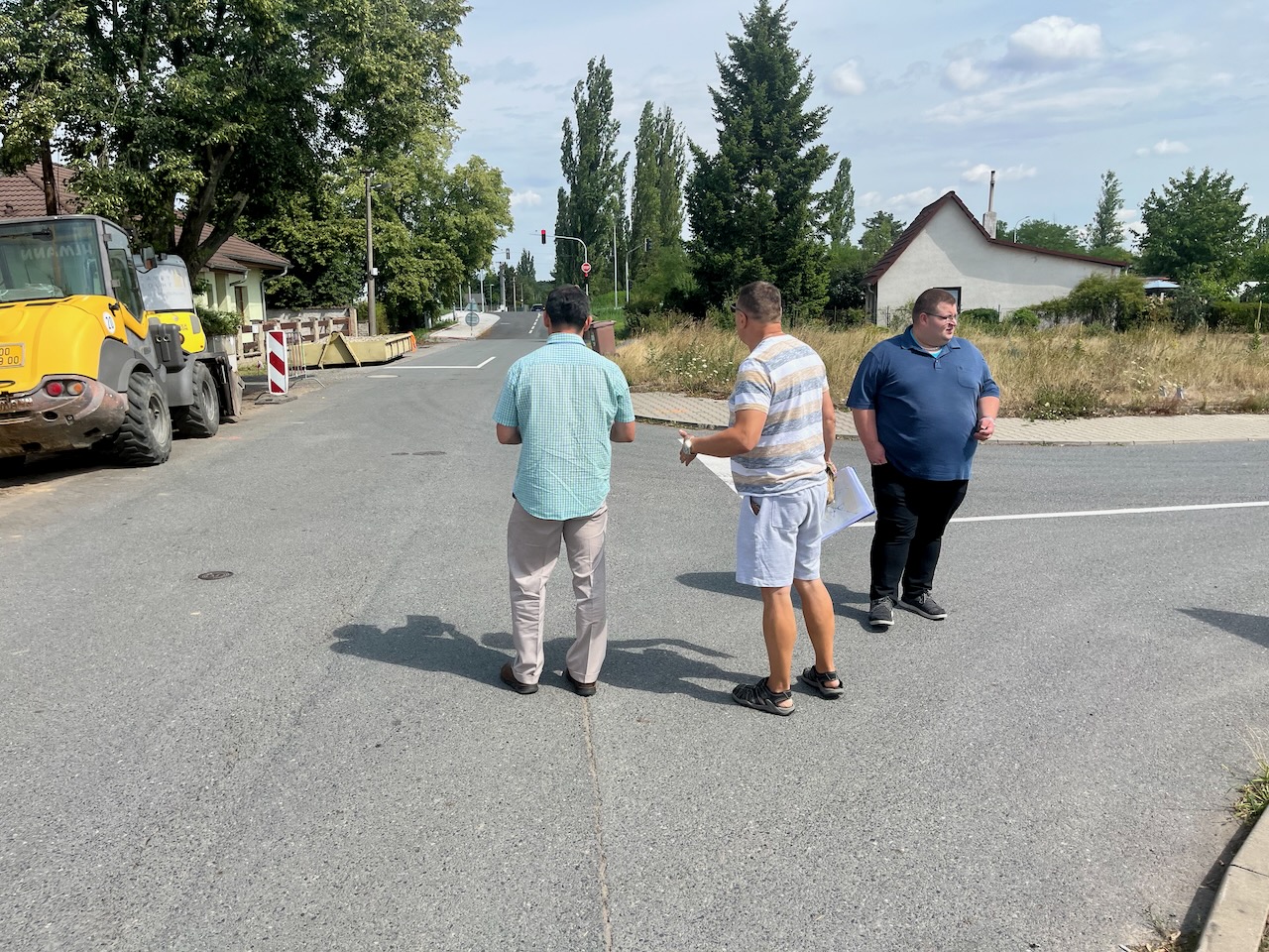 Třebízského ulice dostává nový chodník a také nové značky. Dopravní preventista Radek Fedáček se starostou Robertem Pechou a šéfem technických služeb Michalem Šimonkem na fotografii z cyklu “Zíráme na…” - v tomto případě na to, kde mají být namalované čáry…